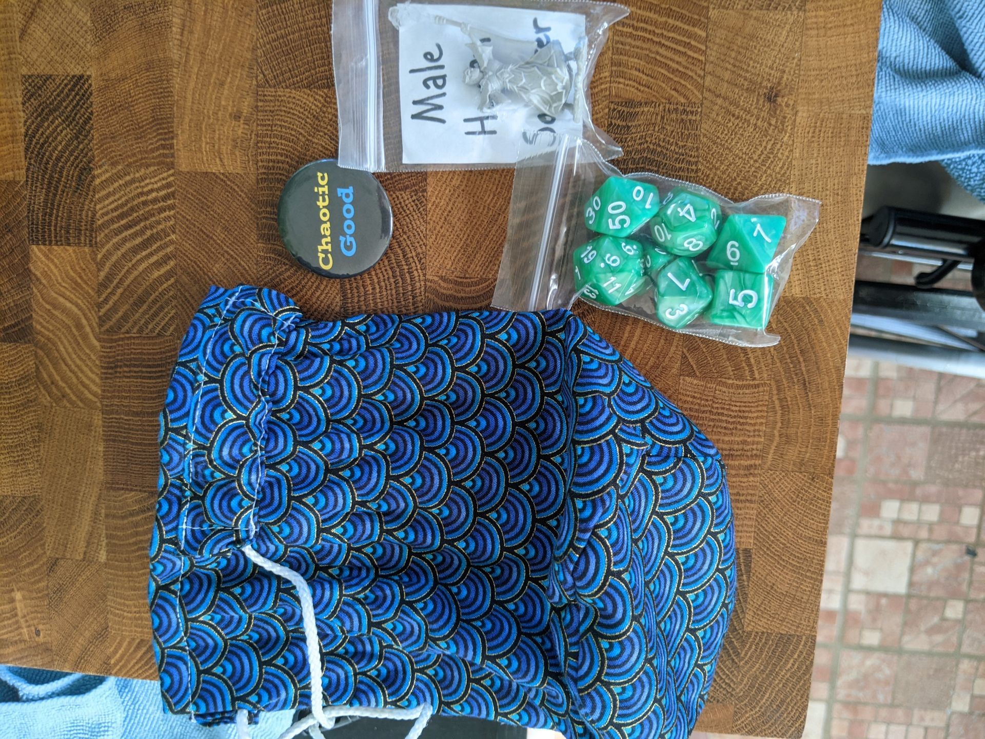 It comes with, of course, a hand sewn dice bag with an internal lining to boot! In addition to that, I have a random set of dice and a random miniature as well as one of the buttons that one of the owners makes, particularly an alignment button.