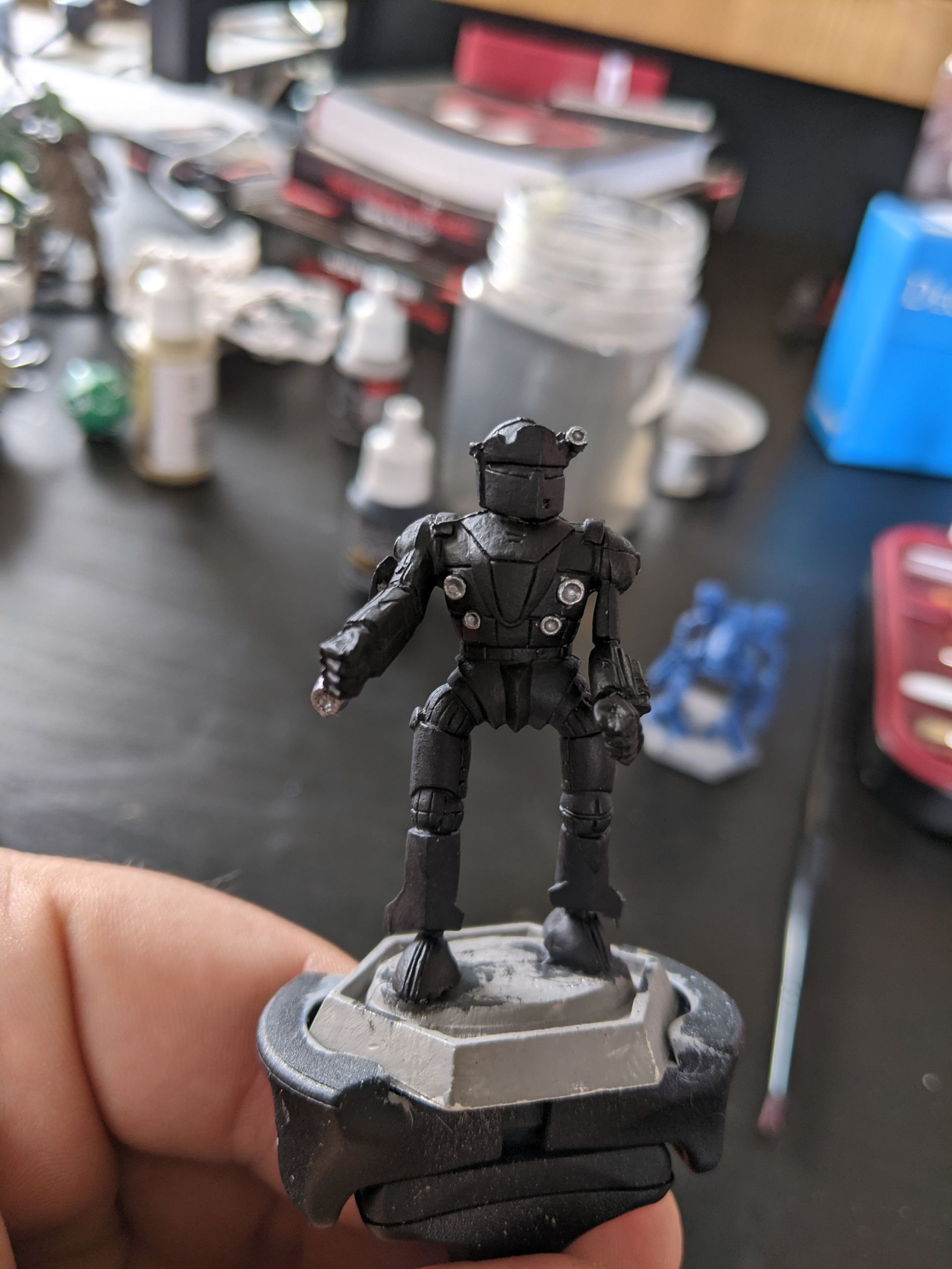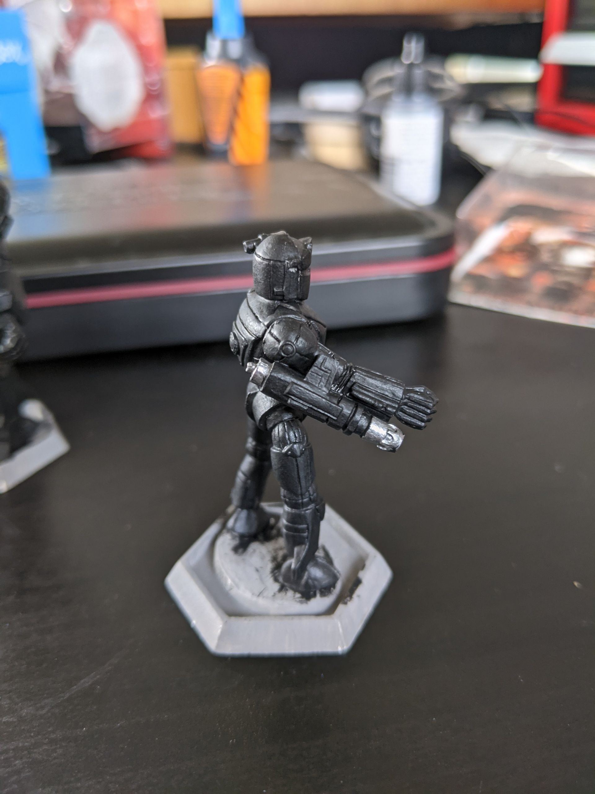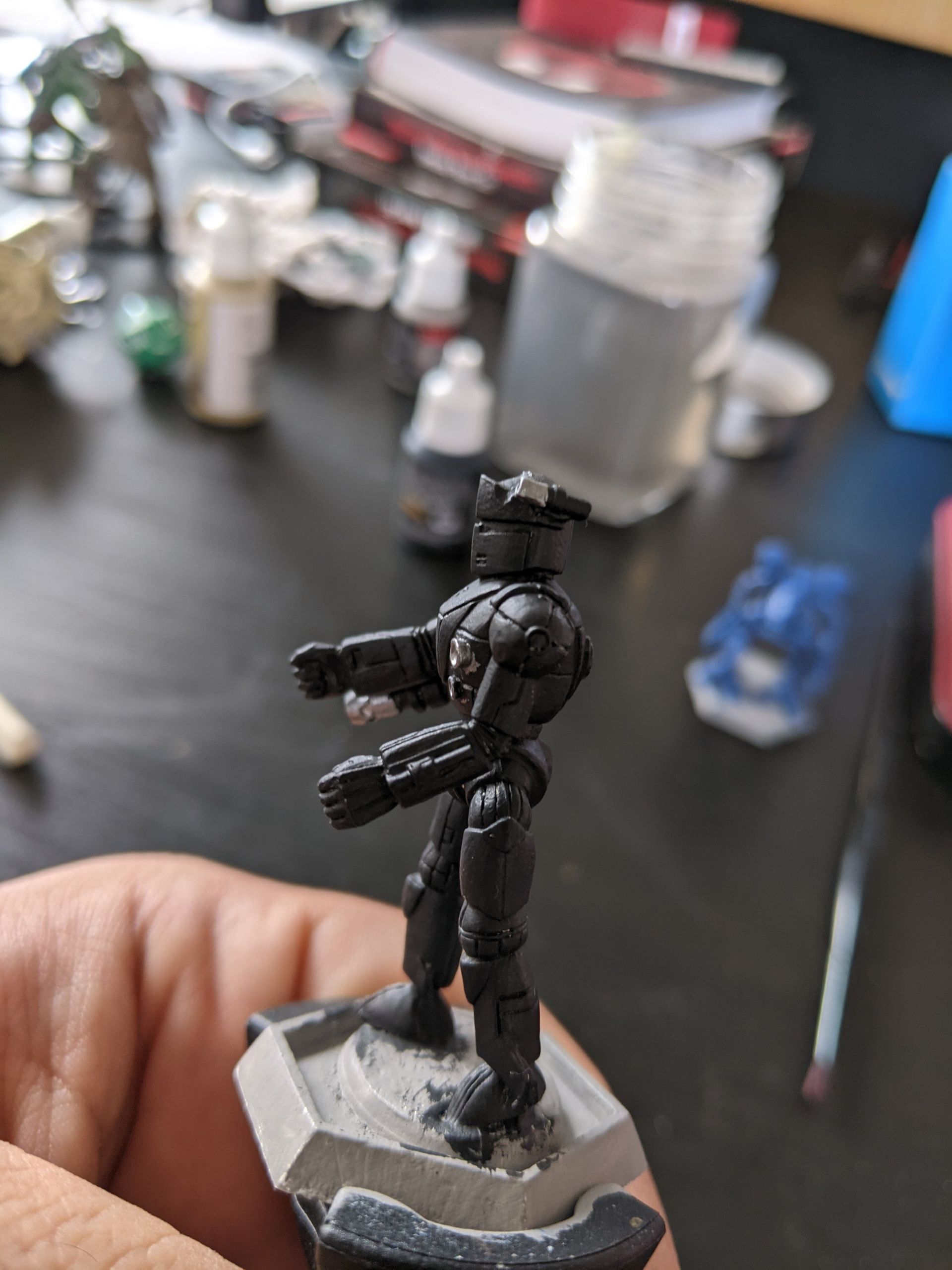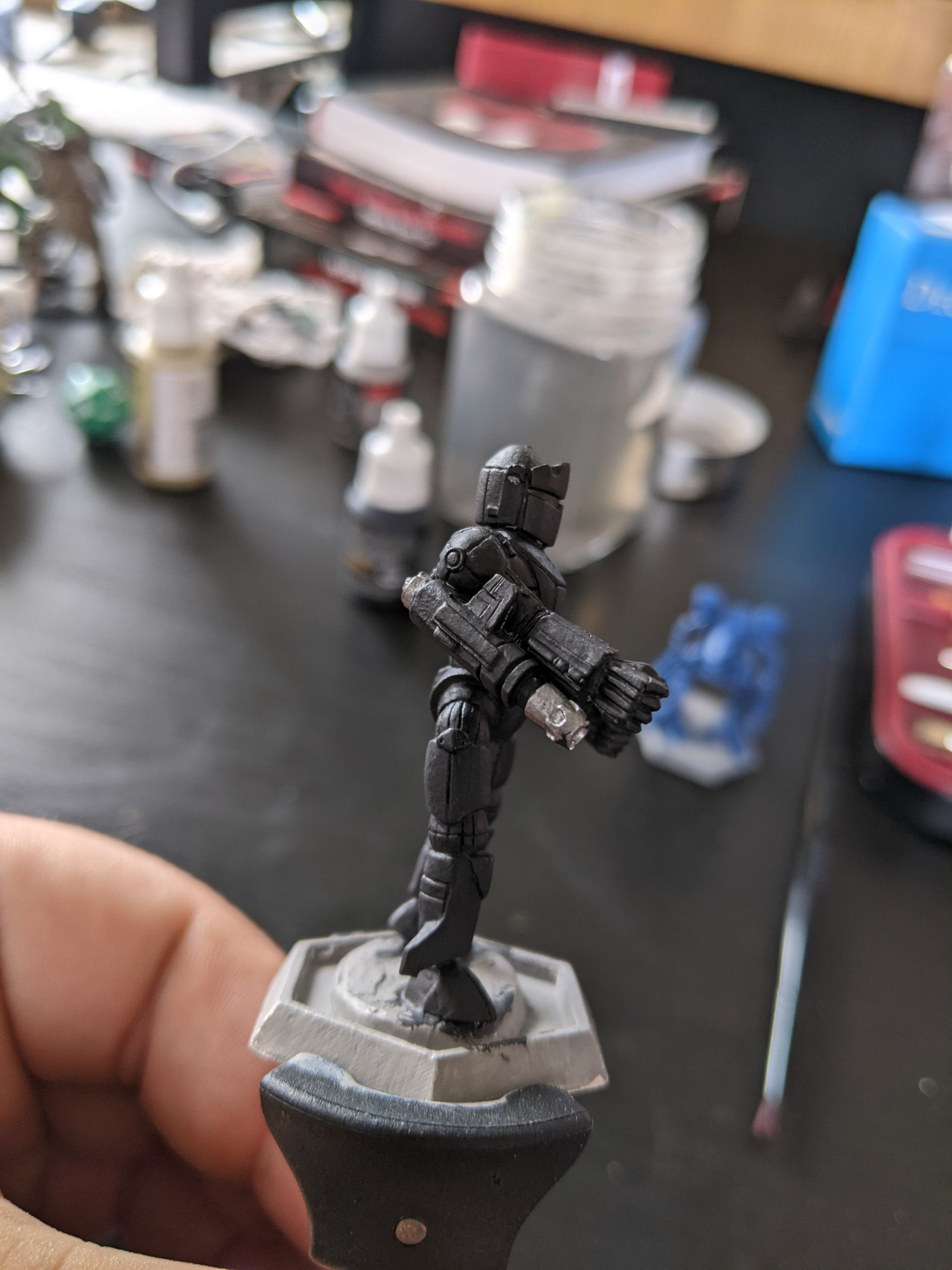 As you can see, I was able to get his base coat done as well as start working on the gunmetal I used for his weapons.