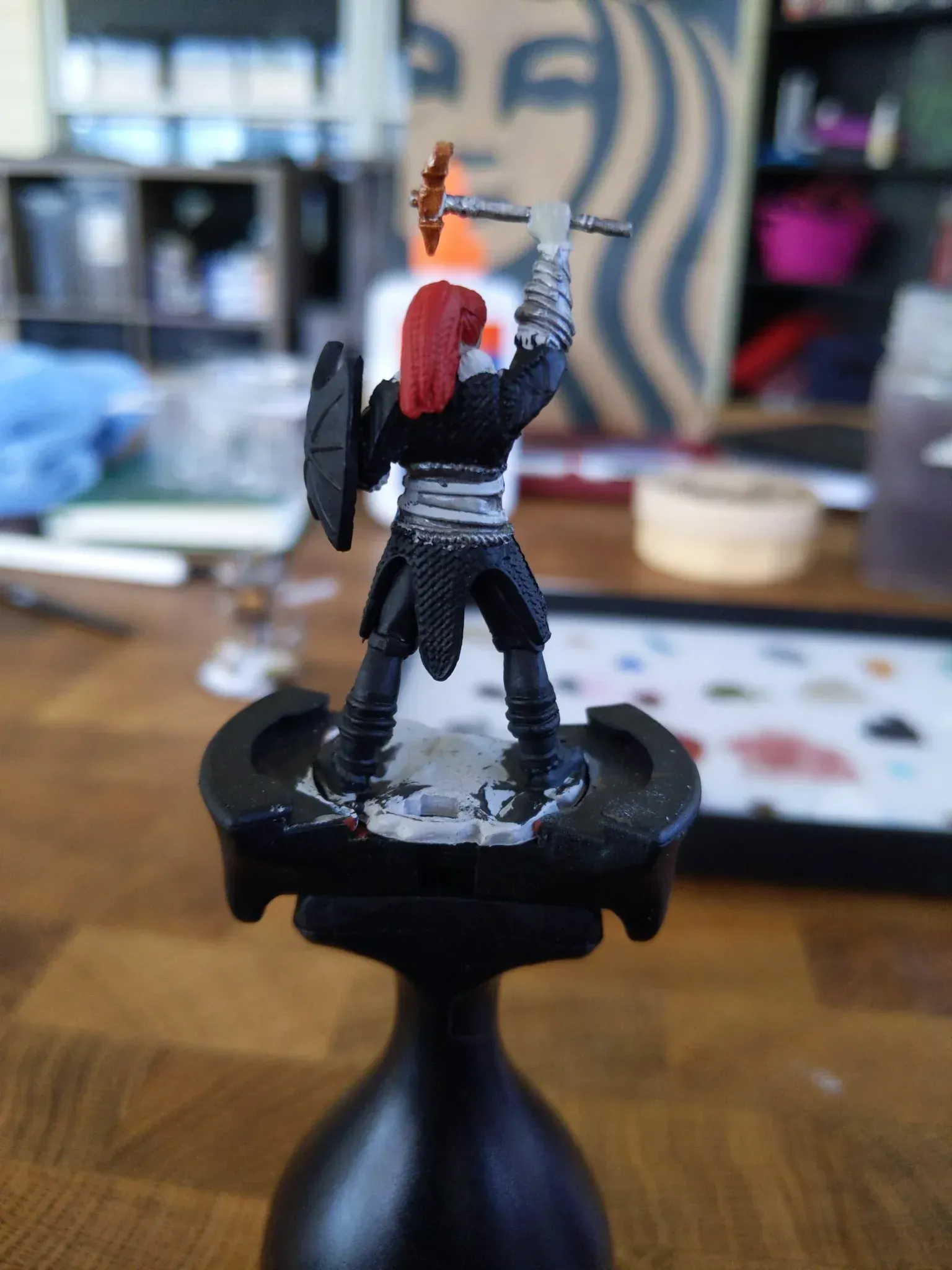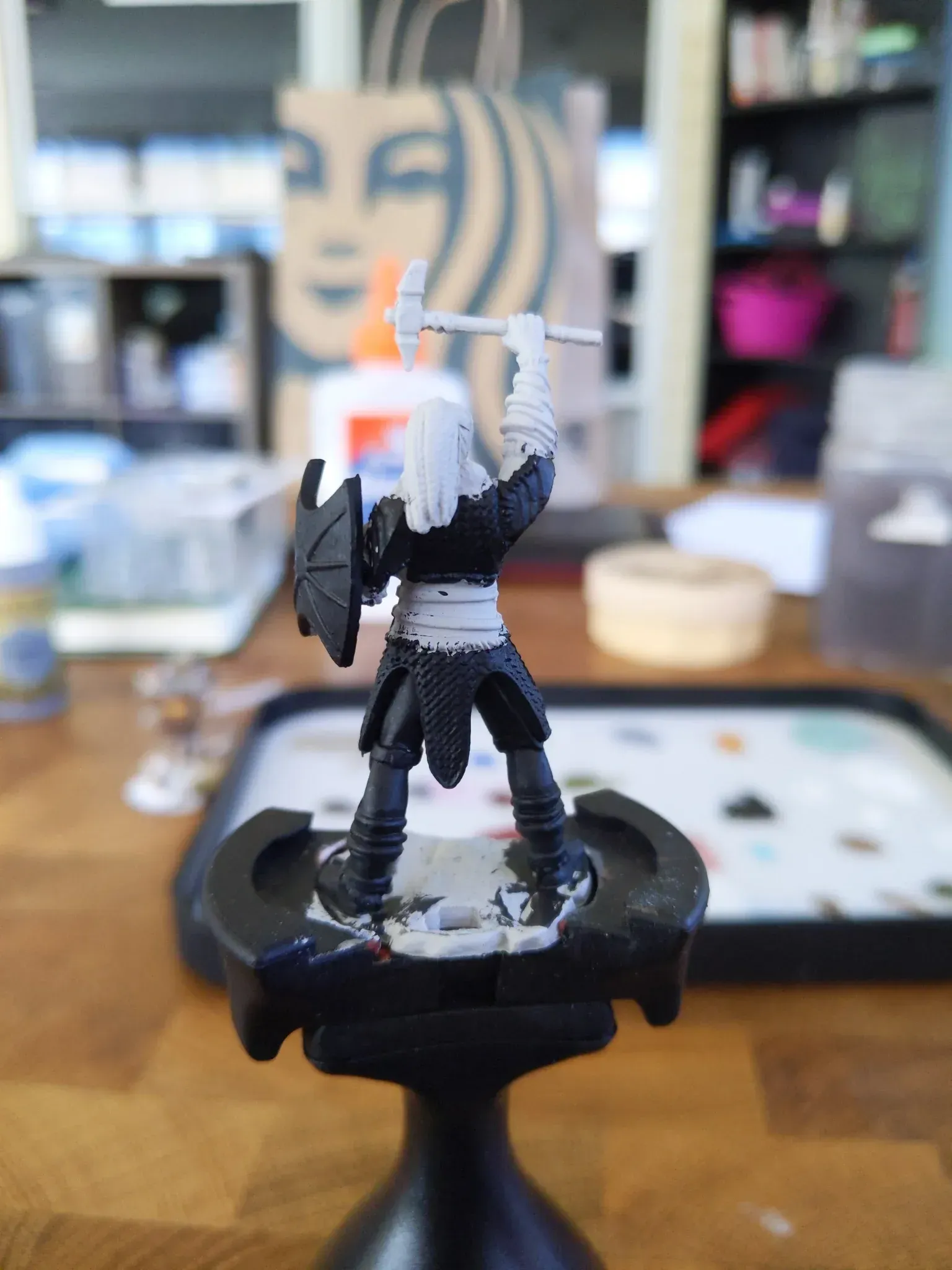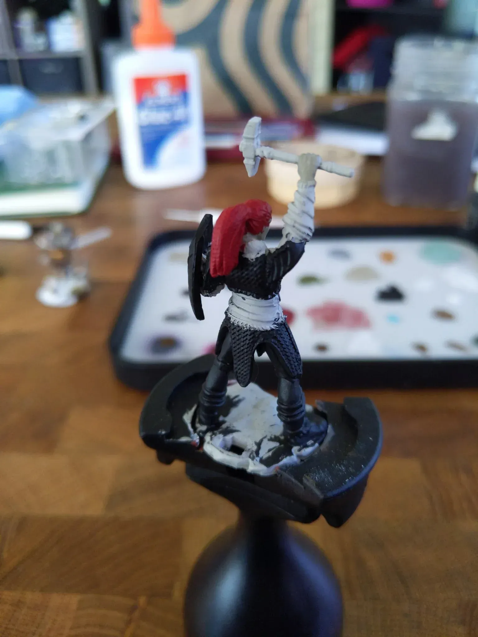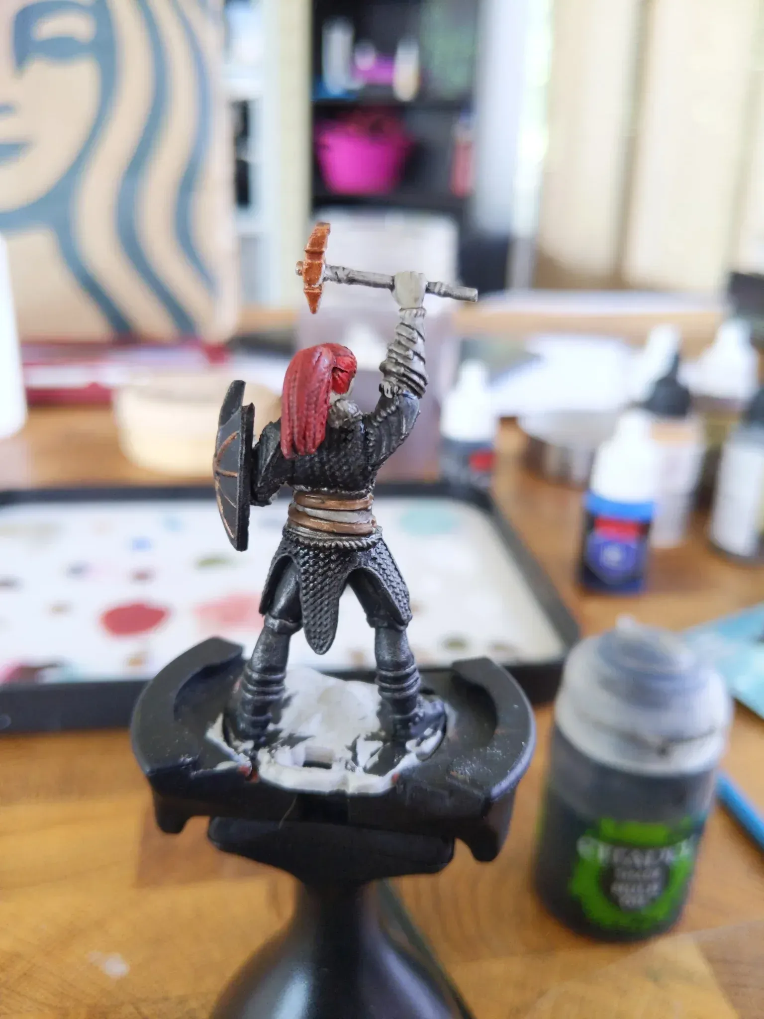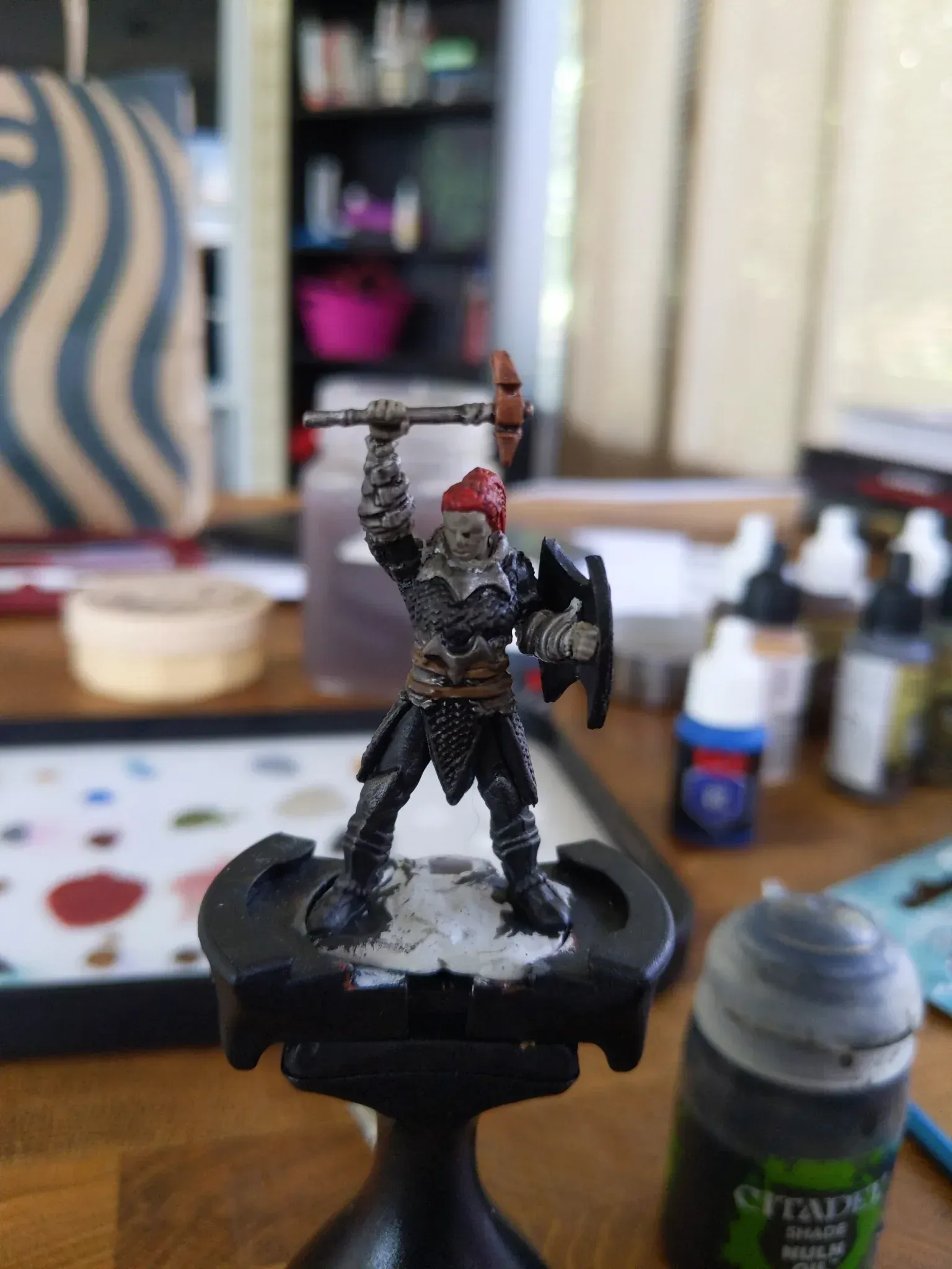 Since she is suffused with dark energy, I decided to use Nuln Oil, as my shader. The hammer itself is a corrupted holy weapon, so this works out perfectly.