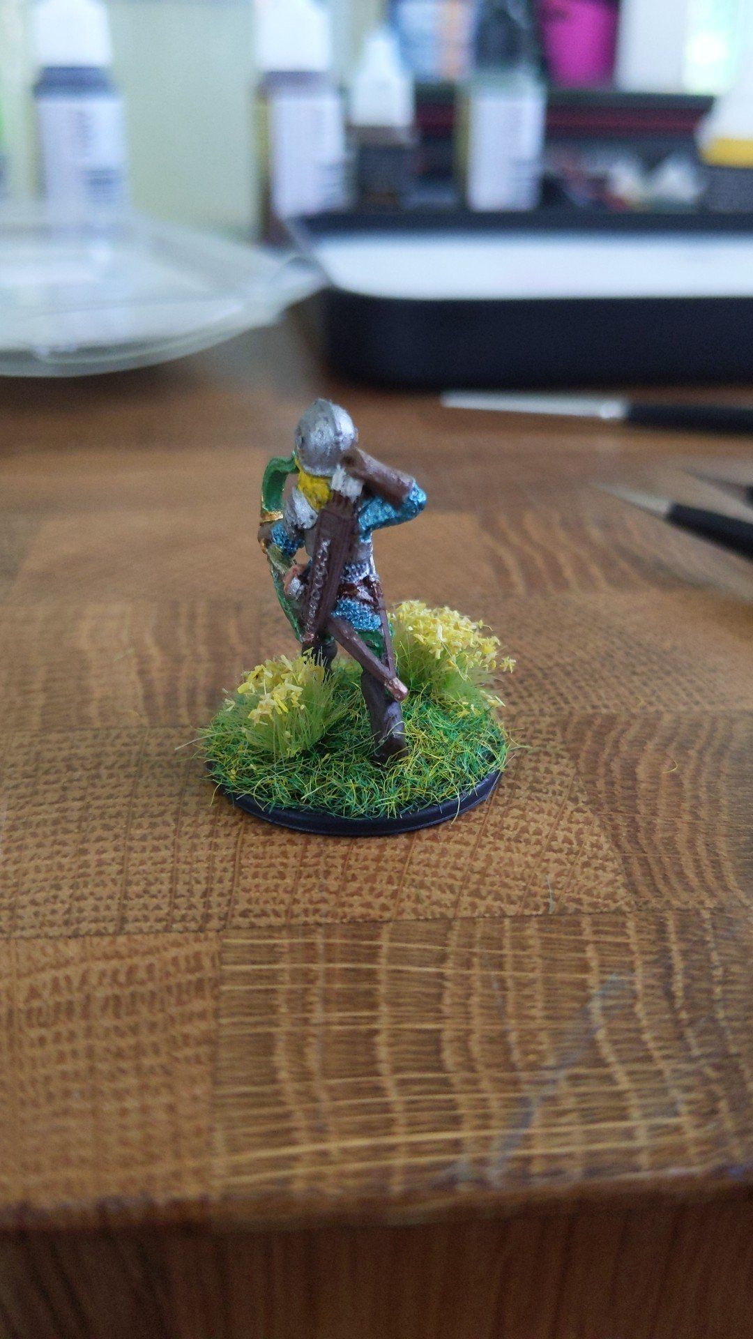 At this point, I had already started working on him, and got his chainmail painted a metallic blue, and his plate mail pieces painted gunmetal. His helmet was, too.