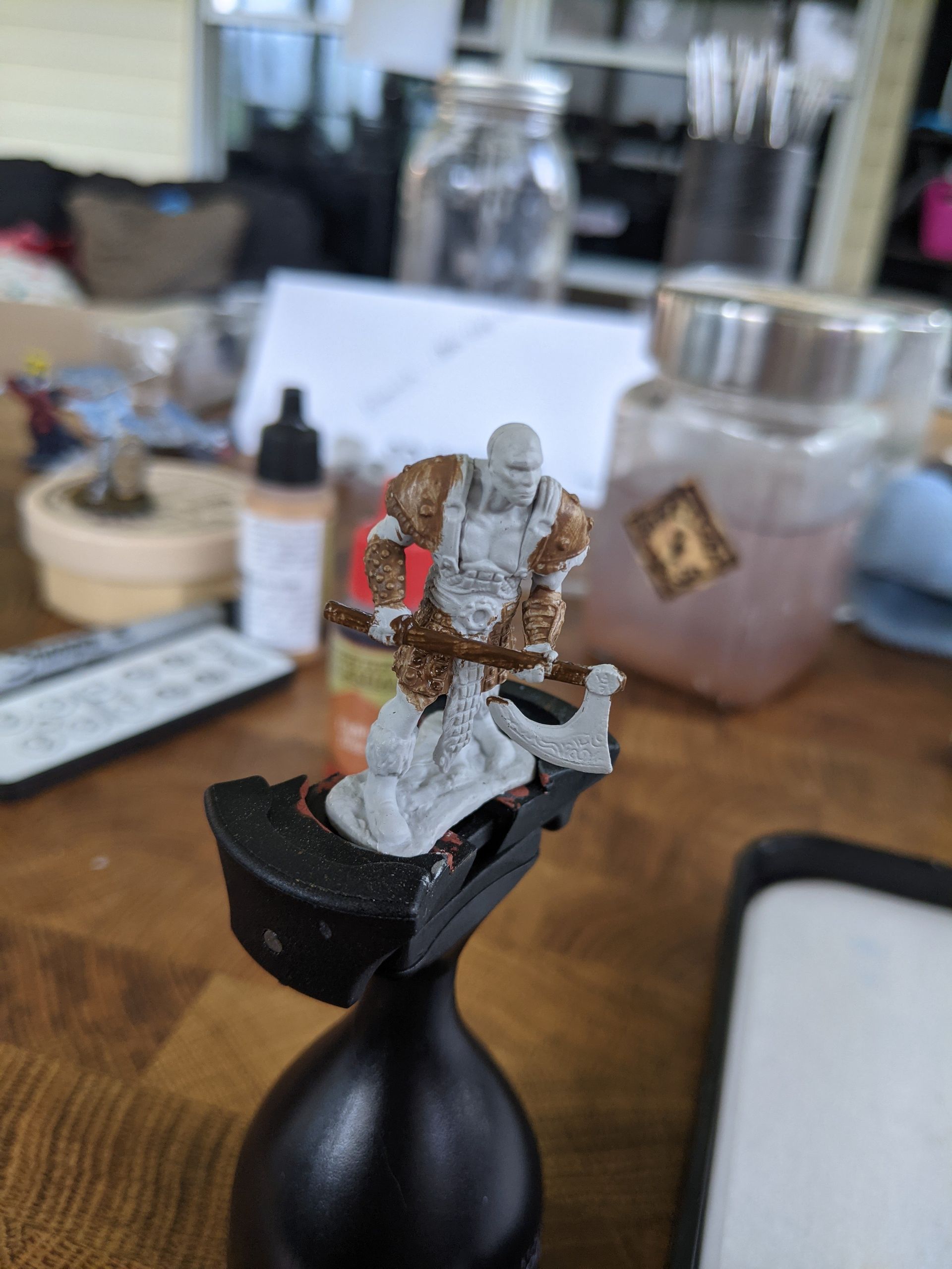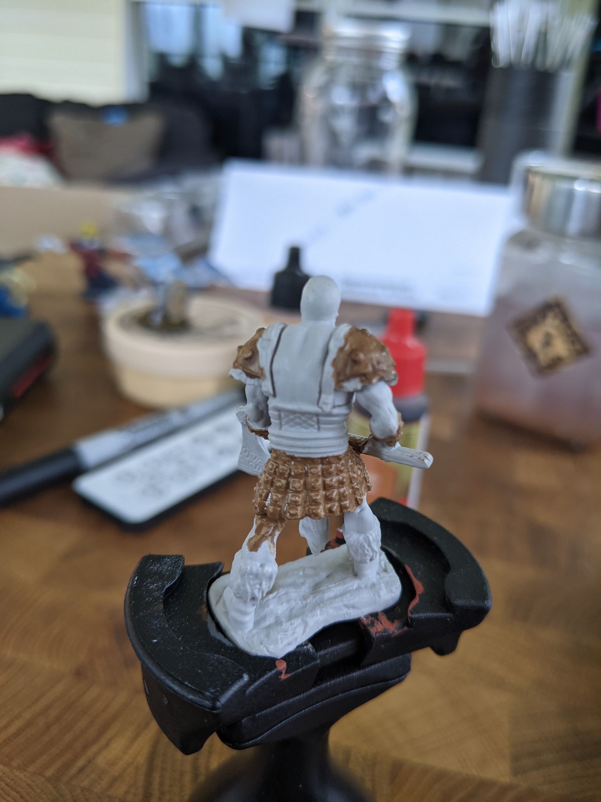 I decided to go with, go figure, Leather Brown for the leather bits. As you can see, I have the pauldrons, the kilt, and the bracers started.