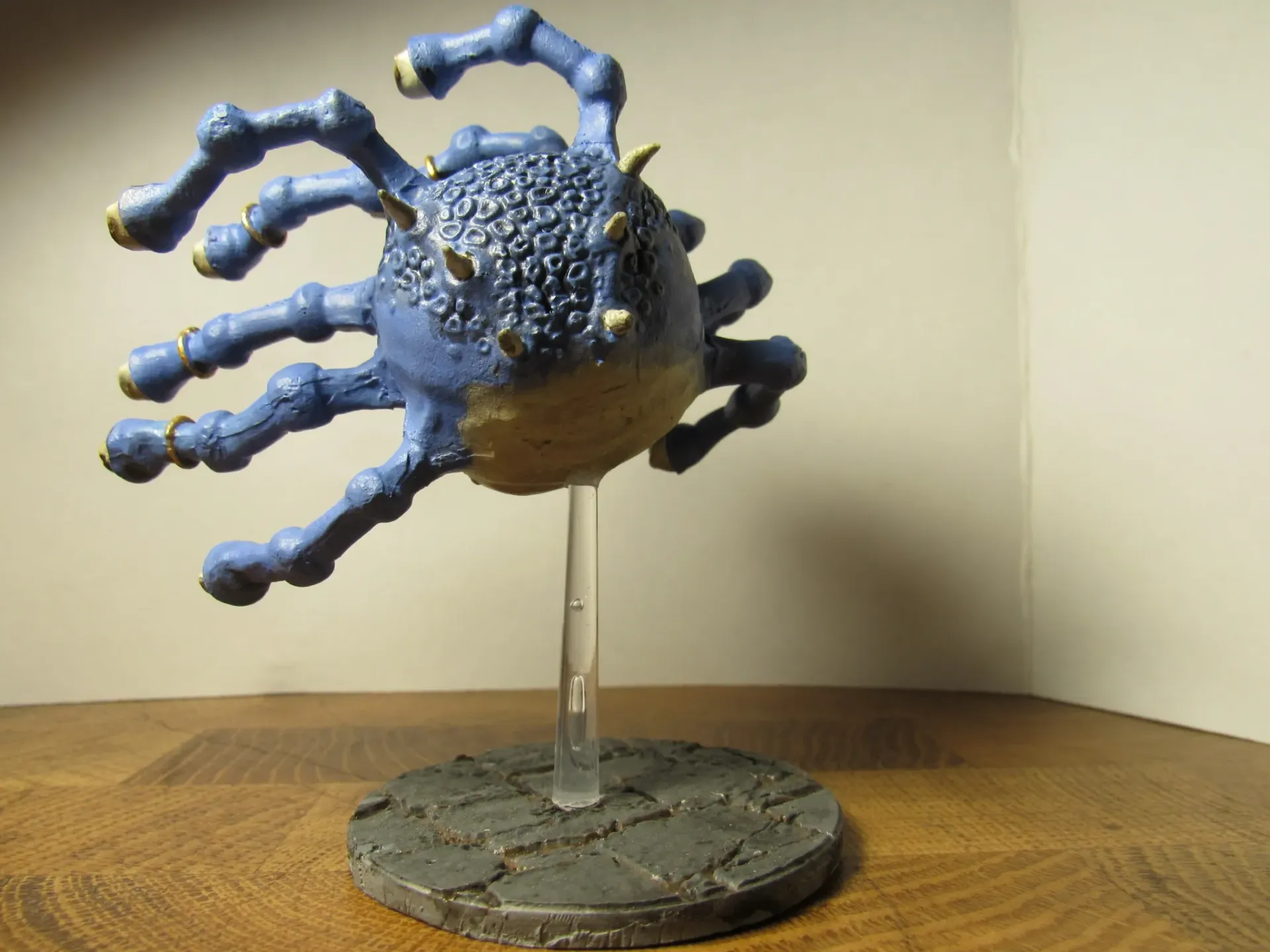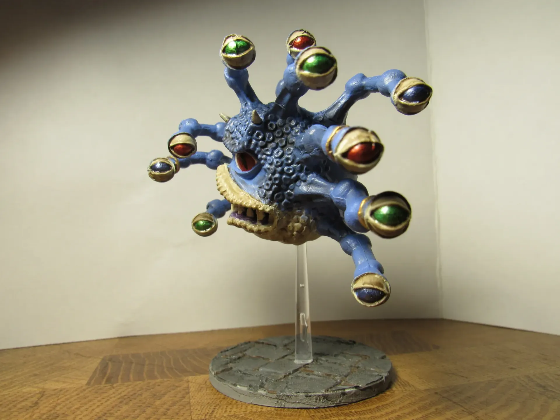 SO! That’s The Xanathar. He’s done. Finally. It’s been a journey, Dear Readers, but he is totally done, and I’m mostly happy with the job I did. Sure, I could have done a better job with the shading, and I likely will go back with a light gloss over him later, but for all intents and purposes, he’s done. Speaking of which, did you like the base? I was particularly proud of how I did on the base, and will likely paint the edge around it black. If I do, I’ll post pictures, I promise.